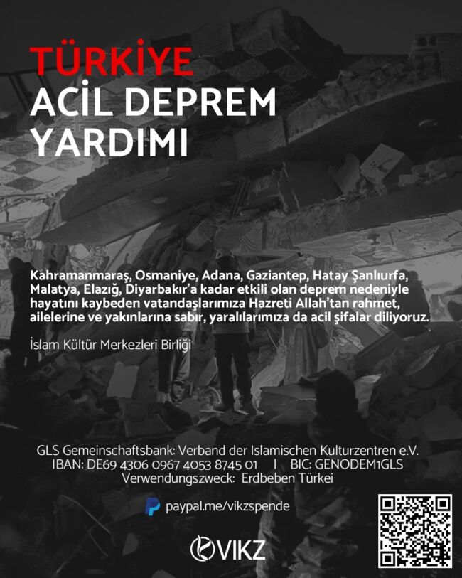 İslam Kültür Merkezleri Birliği (VIKZ) Türkiye’nin güneydoğusunda ve sınır komşusu Suriye’de meydana gelen ve çok sayıda can kaybına sebep olan deprem haberini büyük bir üzüntüyle karşılamaktadır. Saat geçtikçe can kaybı ve yaralıların adedi maalesef yükselmektedir. VIKZ, hayatını kaybedenlere Allahtan rahmet, ailelerine başsağlığı ve yaralılara acil şifalar dilemektedir. Enkaz altında kalanların bir an evvel kurtarılmalarını ümit etmektedir. Geçmiş olsun Türkiye! Allahü Te’ala bu gibi felaketlerden bütün insanlanlığı korusun!